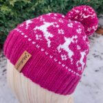 Anliegende Damenhaube mit wunderbar gestricktem Rentier-Muster und Schneeflocken.